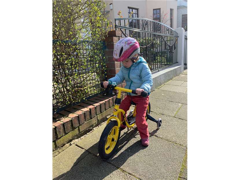 Sara aus dem Kinderhaus HAFEN übt das Laufen mit Zoeys Laufrad.