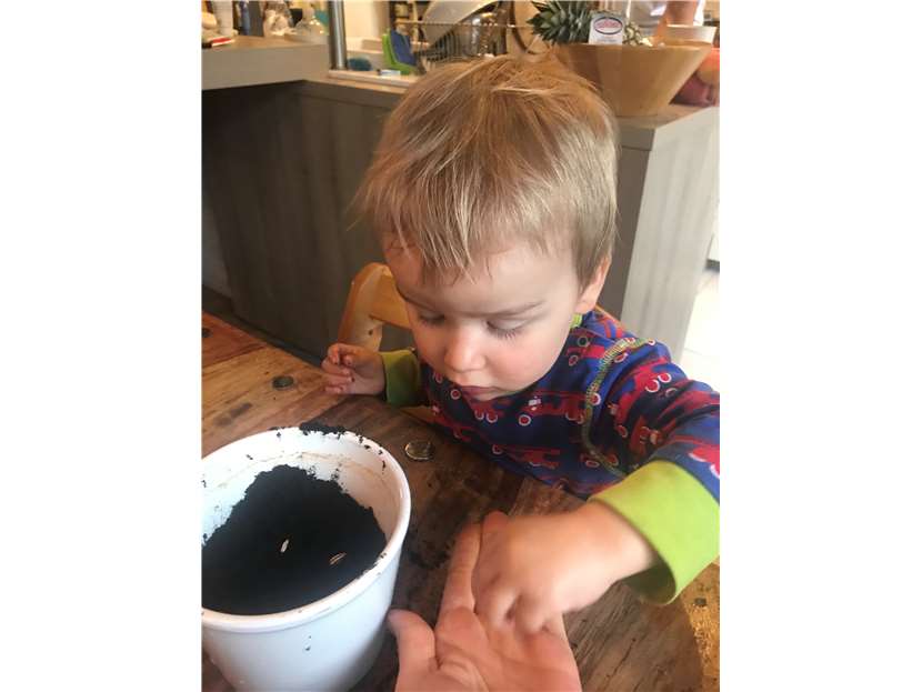Caspar aus dem Kinderhaus HAFEN hat viel Spaß beim Einpflanzen.
