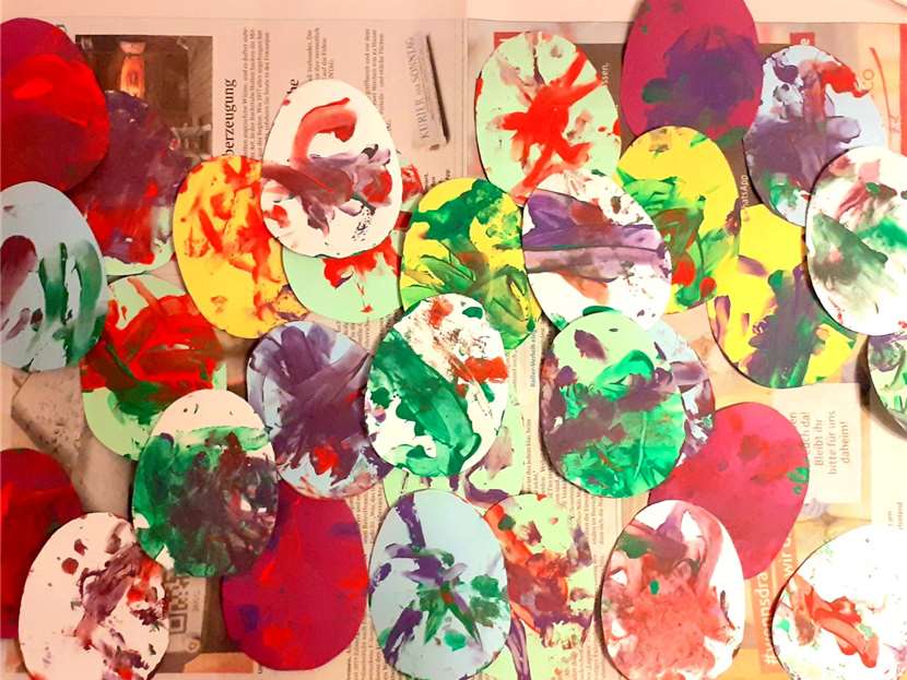 Noura grüßt mit ihren selbstgebastelten Ostereiern die Kinder der Dschungelgruppe im Kinderhaus QUIRL