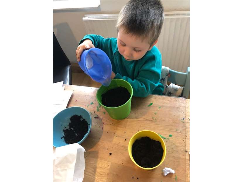 Caspar aus dem Kinderhaus HAFEN hat viel Spaß beim Einpflanzen.